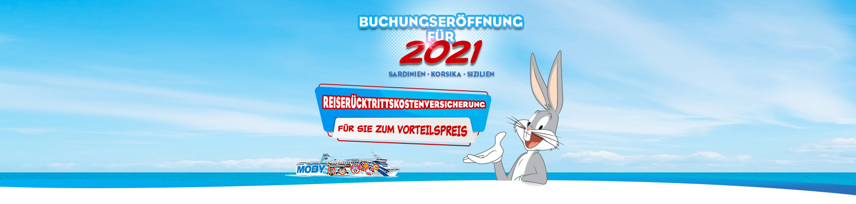 Wenn Sie bis 31/12/2020 buchen, erhalten Sie die Multi-Risk-Reiserücktrittskostenversicherung zum Vorteilspreis von 1€ pro Strecke.Das Angebot gilt für Buchungen bis 31/12/2020 für Abfahrten nach Sardinien, Korsika und Sizilien, die mehr als 24 Stunden vor der geplanten Abfahrtszeit erfolgen.Bitte lesen Sie hier was die Reiserücktrittskostenversicherung beinhaltet.